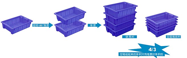 該種類別的產(chǎn)品利用在兩個(gè)相對的側(cè)面(可能是長面,也可能是短面)采取不同的結(jié)構(gòu)的方式,實(shí)現(xiàn)在空箱放置時(shí)按結(jié)構(gòu)面相同的方式插入時(shí),可以相互插到一起,而在箱(或筐)裝滿貨物時(shí),則按結(jié)構(gòu)面不同的方向配合碼放(及上下箱體不同結(jié)構(gòu)面錯(cuò)開180度,則可以實(shí)現(xiàn)上箱堆碼在下箱之上而不壓到貨物,可以碼放20層左右。 優(yōu)點(diǎn):空箱時(shí)大大節(jié)省了空間,在運(yùn)輸中大大節(jié)省了運(yùn)輸成本,一般空箱插入碼放比載荷時(shí)堆碼要節(jié)省70%的空間。